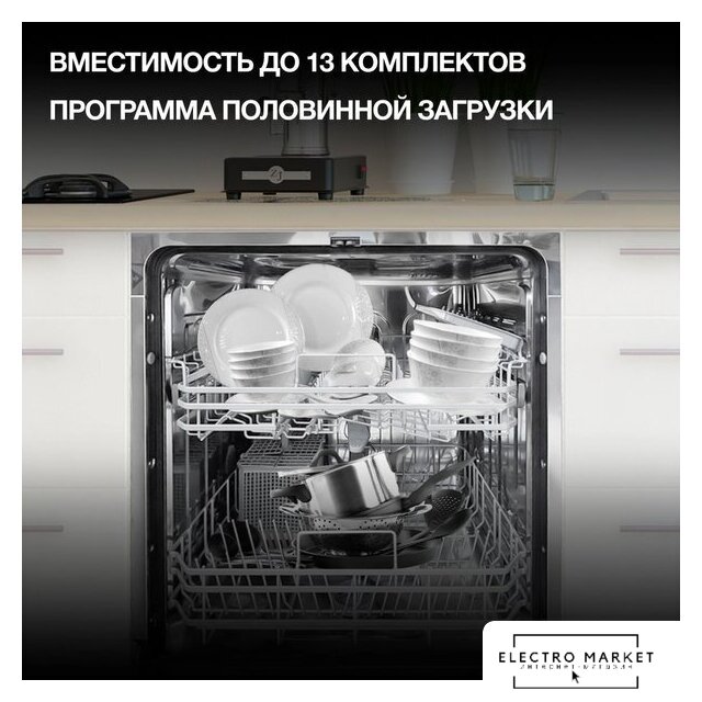 загрузка на 13 комплектов посуды, сенсорное управление, 10 программ, 59.5x55x87.5 см, черный цвет, сушка: стандартная (конденсация), индикация на полу: нет