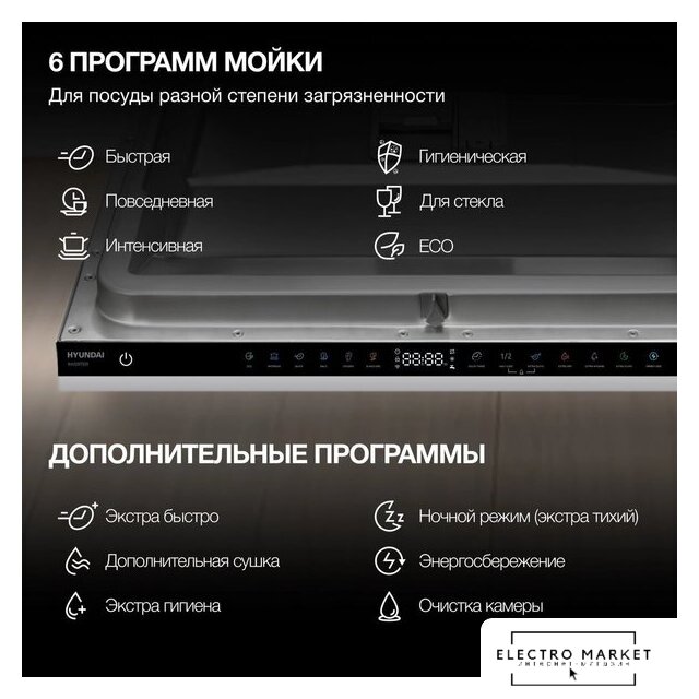 Дополнительные опции | сокращение времени мойки, дополнительная сушка, усиление интенсивности мойки (гигиеническая мойка), половинная загрузка (экономия воды), программа самоочистки |