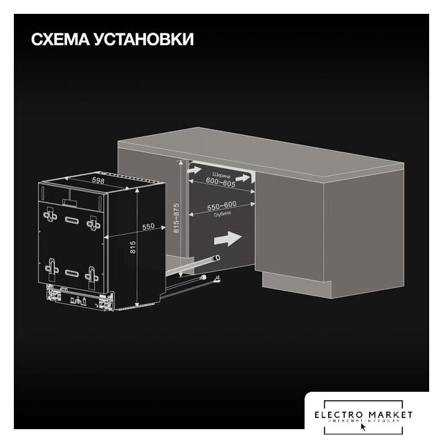 загрузка на 13 комплектов посуды, сенсорное управление, 7 программ, 59.6x55x82 см, черный цвет, сушка: с открыванием дверцы, индикация на полу: луч