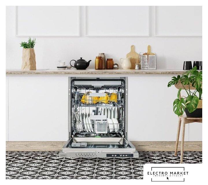 загрузка на 15 комплектов посуды, сенсорное управление, 7 программ, 59.6x55x82 см, черный цвет, сушка: стандартная (конденсация), индикация на полу: нет