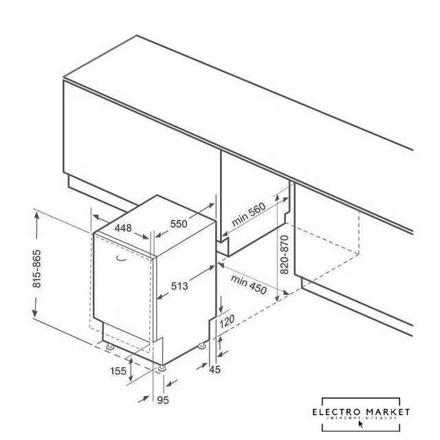загрузка на 9 комплектов посуды, электронное управление, 5 программ, 44.8x55x82 см, черный цвет, сушка: стандартная (конденсация), индикация на полу: нет