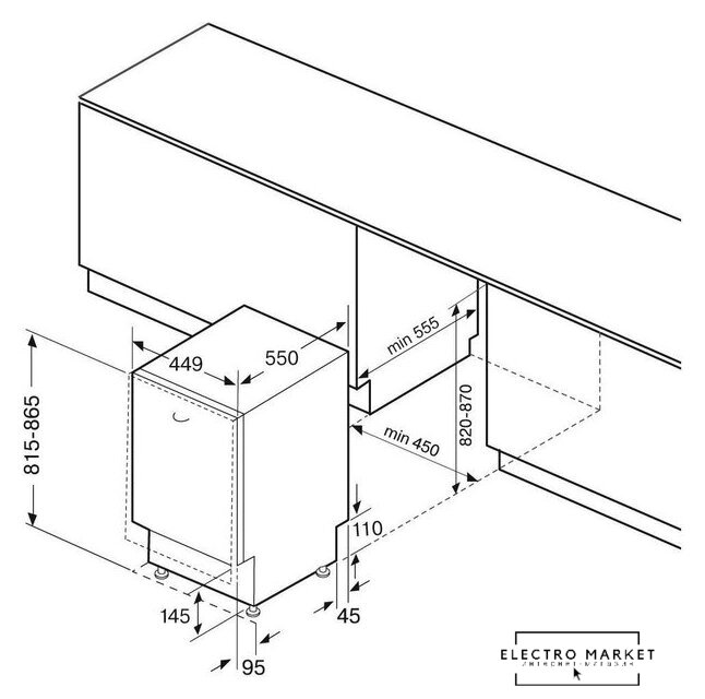 загрузка на 10 комплектов посуды, электронное управление, 8 программ, 44.8×55×82 см, черный цвет, сушка: активная конденсация, половинная загрузка, индикация на полу: луч