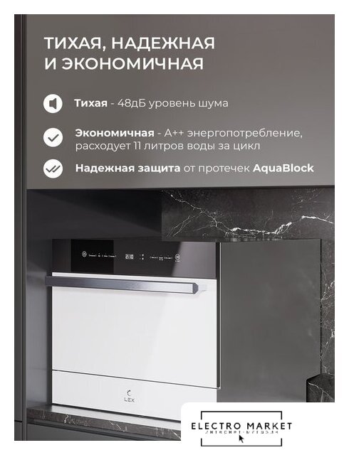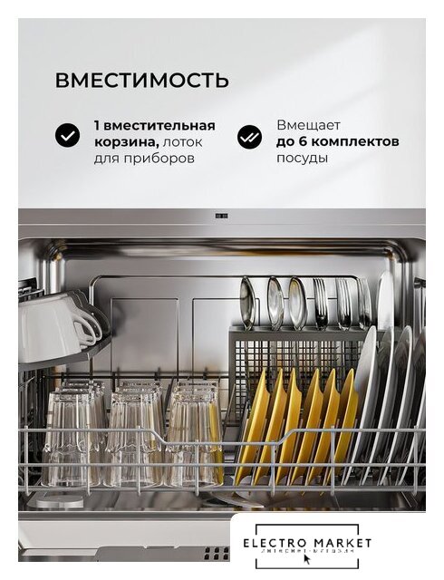 загрузка на 6 комплектов посуды, электронное управление, 5 программ, серебристый цвет, сушка: конденсационная, индикация на полу: нет