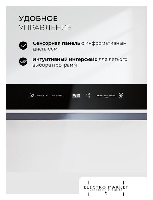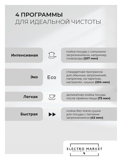 загрузка на 9 комплектов посуды, электронное управление, 4 программы, 44.8x55x82 см, черный цвет, сушка: стандартная (конденсация), индикация на полу: луч