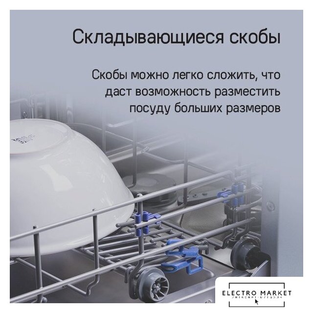 Особенности верхней корзины | регулировка положения по высоте, складывающиеся держатели |