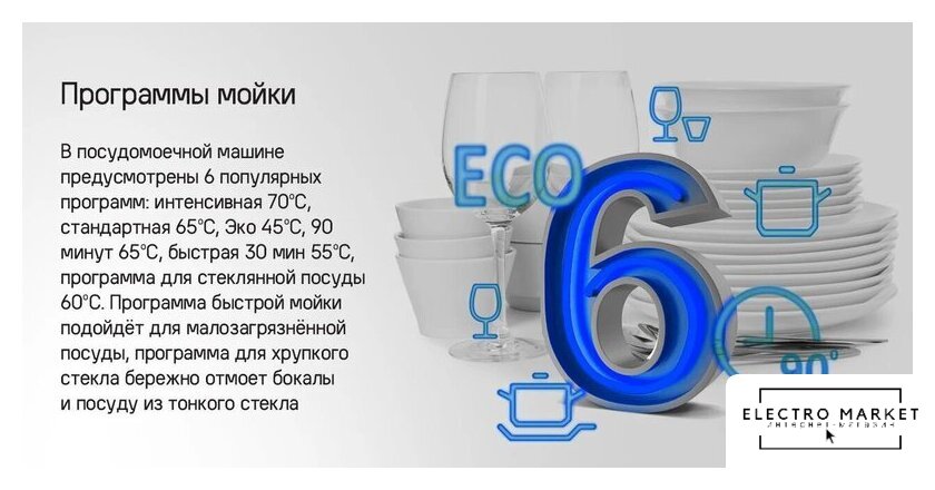 загрузка на 12 комплектов посуды, электронное управление, 6 программ, 59.8x55x82 см, черный цвет, сушка: стандартная (конденсация), индикация на полу: нет