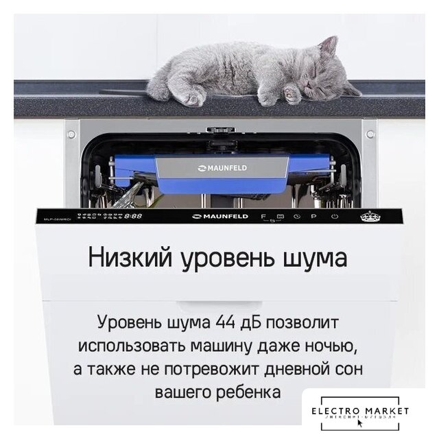 загрузка на 9 комплектов посуды, сенсорное управление, 8 программ, 44.6x55x82 см, черный цвет, сушка: с открыванием дверцы, индикация на полу: луч
