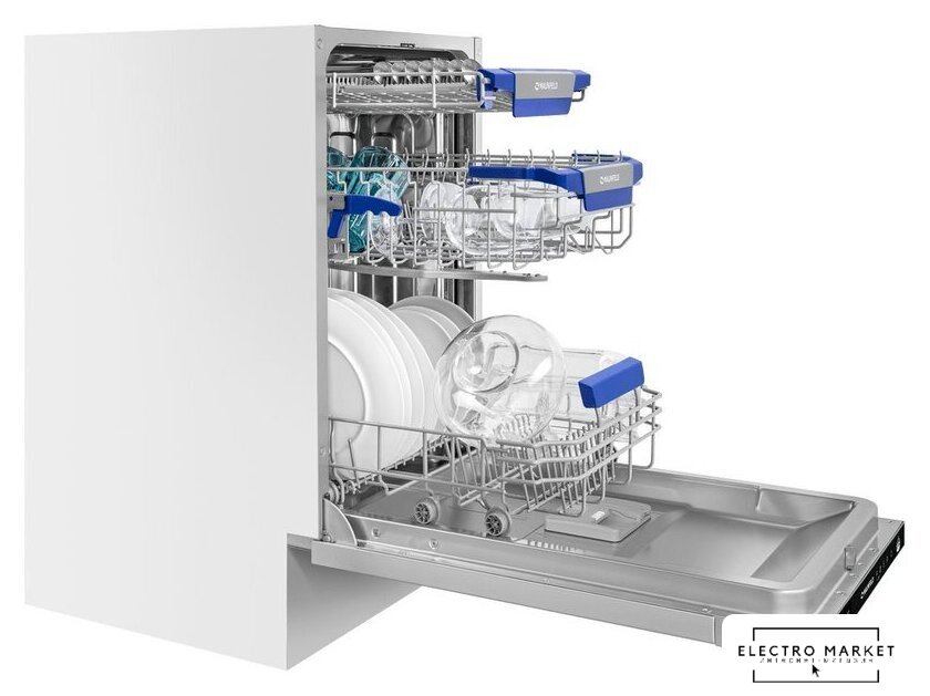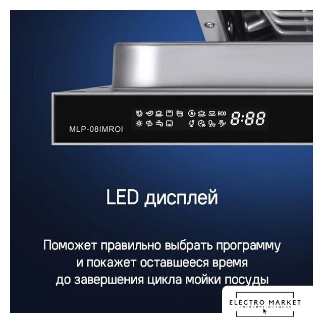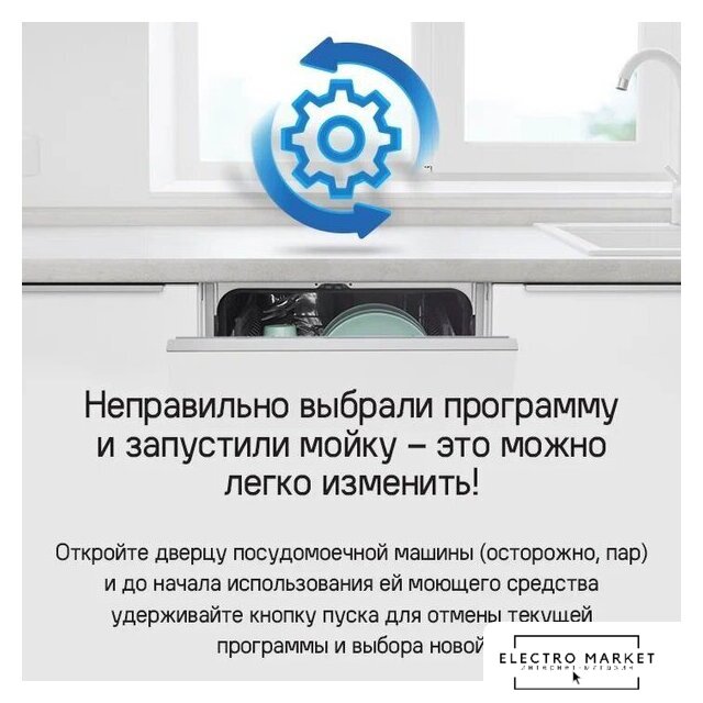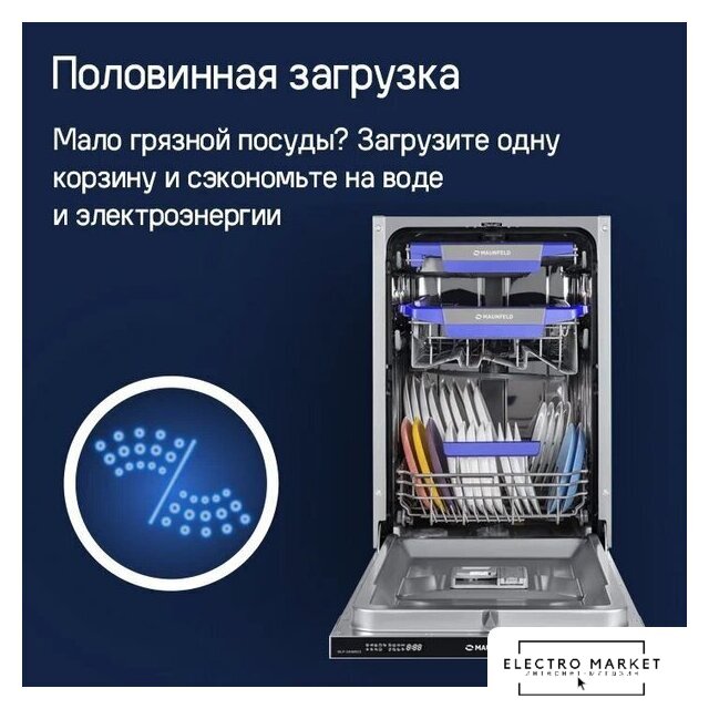 | Дополнительные опции | сокращение времени мойки, дополнительная сушка, половинная загрузка (экономия воды) |