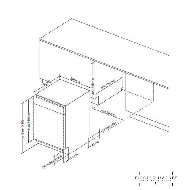 загрузка на 14 комплектов посуды, электронное управление, 6 программ, 59.8x55x82 см, черный цвет, сушка: стандартная (конденсация), индикация на полу: луч