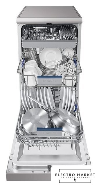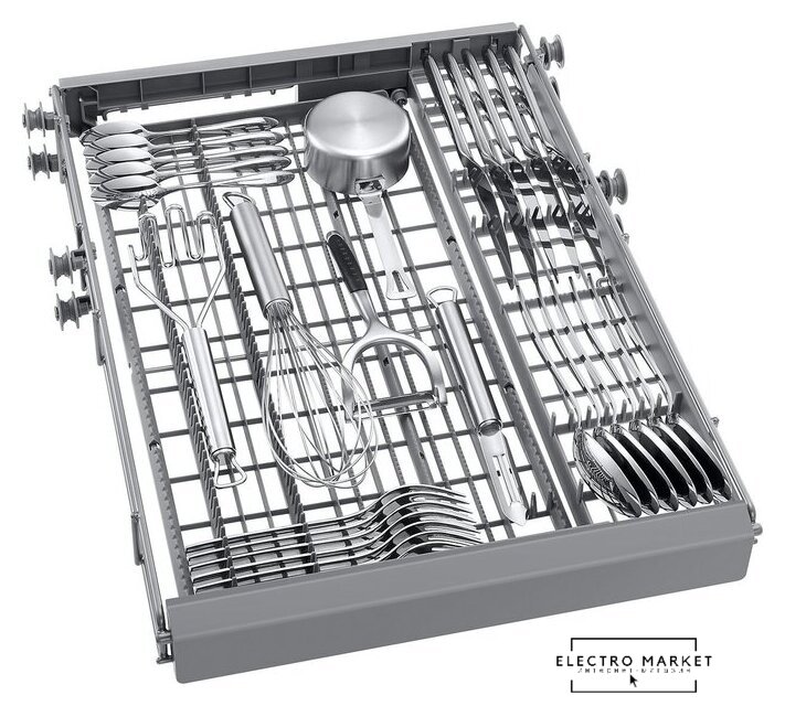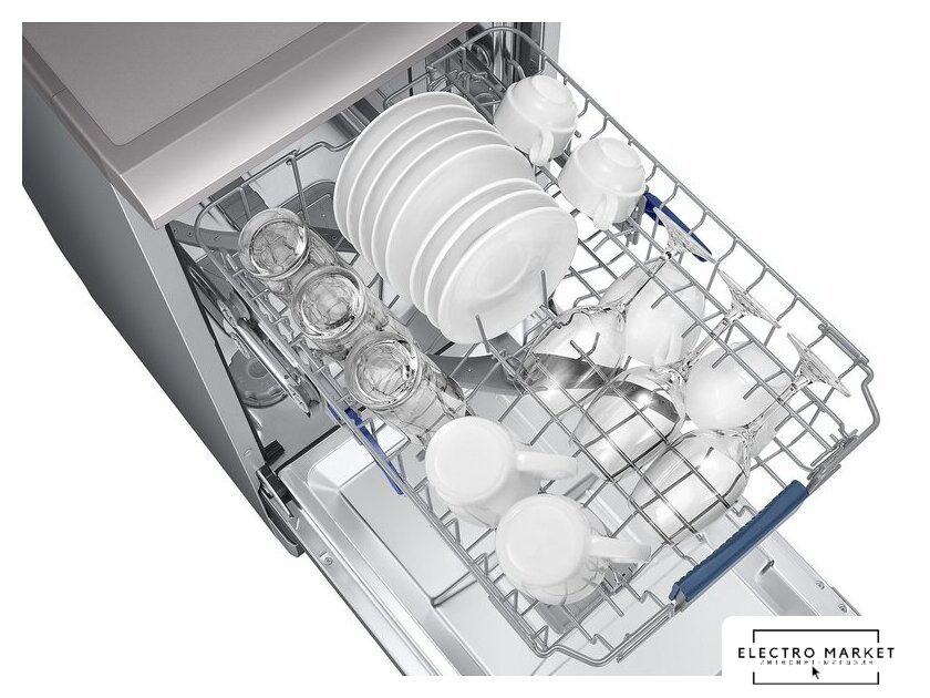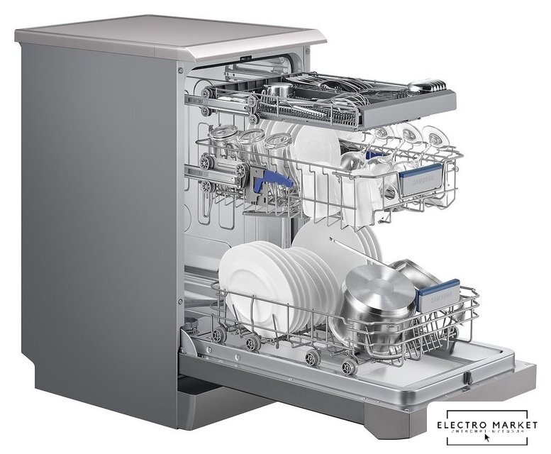 загрузка на 14 комплектов посуды, электронное управление, 7 программ, серебристый цвет, сушка: с теплообменником, индикация на полу: нет