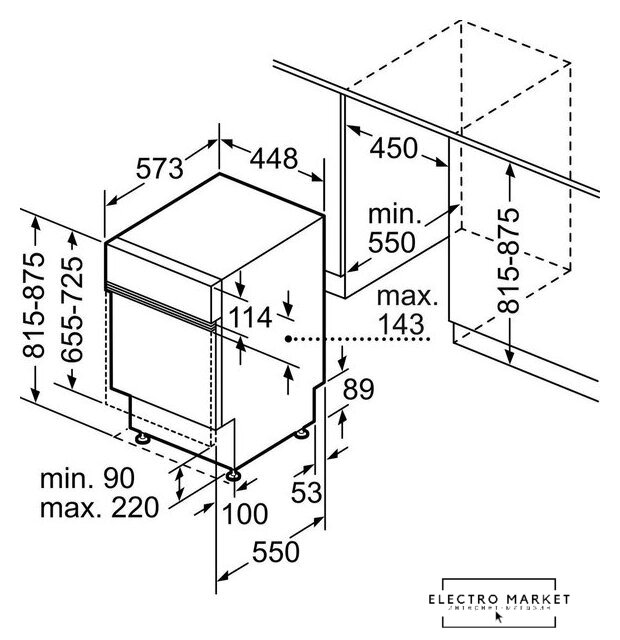 загрузка на 10 комплектов посуды, сенсорное управление, 8 программ, 44.6x55x82 см, черный цвет, сушка: стандартная (конденсация)/с открыванием дверцы, индикация на полу: проекция дисплея