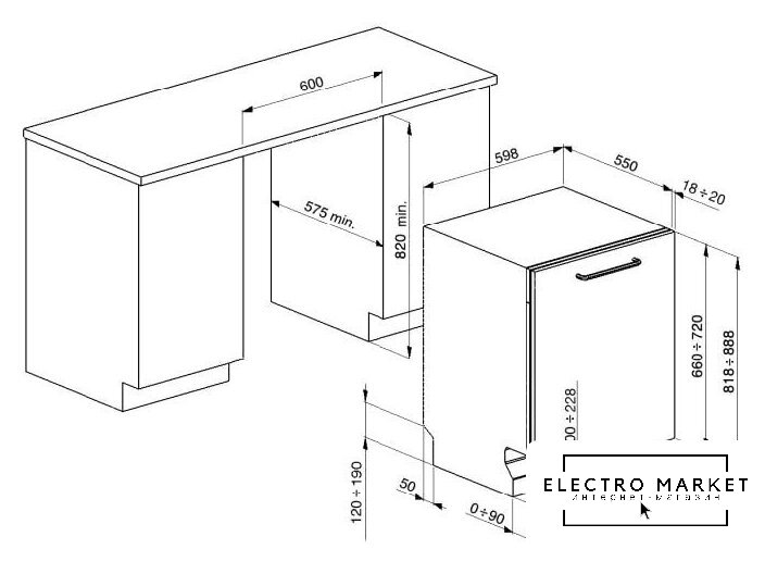 загрузка на 15 комплектов посуды, сенсорное управление, 8 программ, 59.6x55x82 см, черный цвет, сушка: с открыванием дверцы, индикация на полу: луч