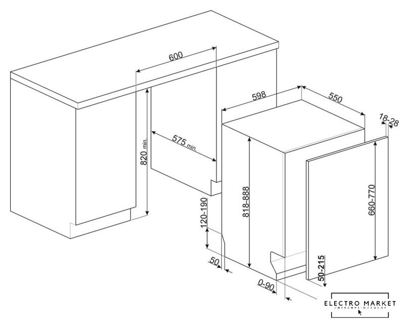 загрузка на 15 комплектов посуды, сенсорное управление, 7 программ, 59.6x55x82 см, белый цвет, сушка: с открыванием дверцы, индикация на полу: луч