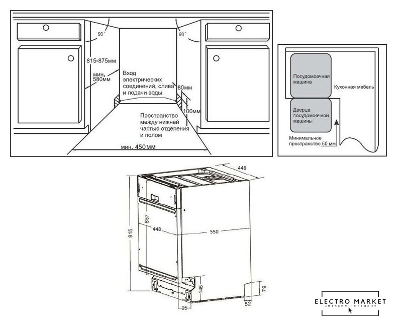 загрузка на 9 комплектов посуды, электронное управление, 5 программ, 44.8x55x82 см, черный цвет, сушка: стандартная (конденсация), индикация на полу: луч