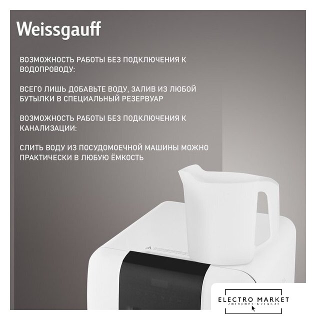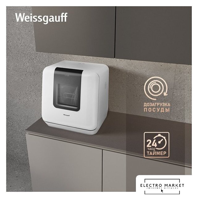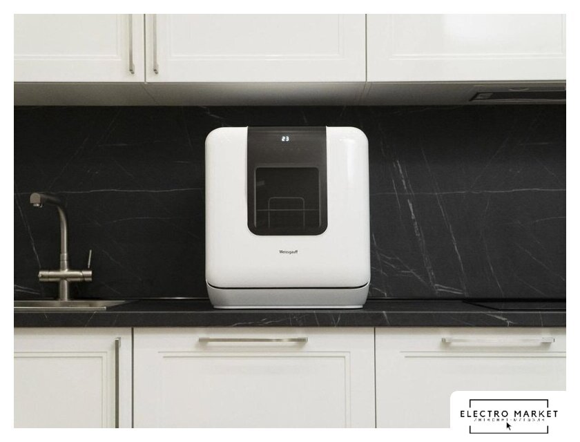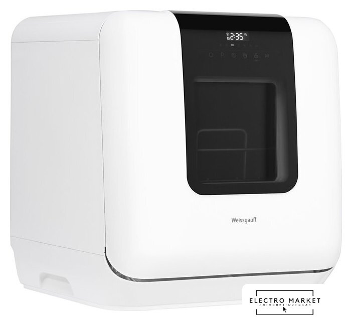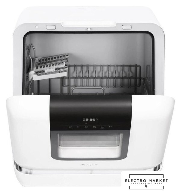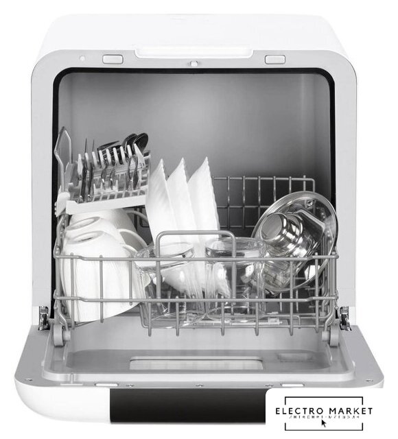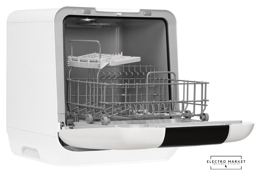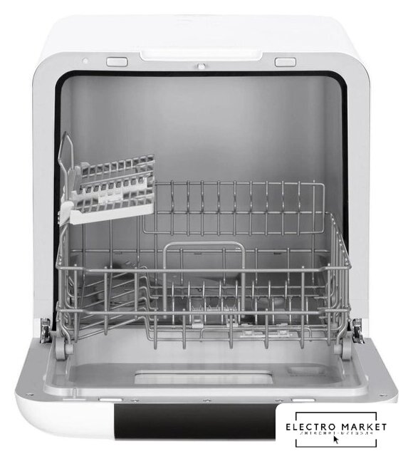 загрузка на 6 комплектов посуды, электронное управление, 6 программ, белый/черный цвет, сушка: конденсационная, индикация на полу: нет