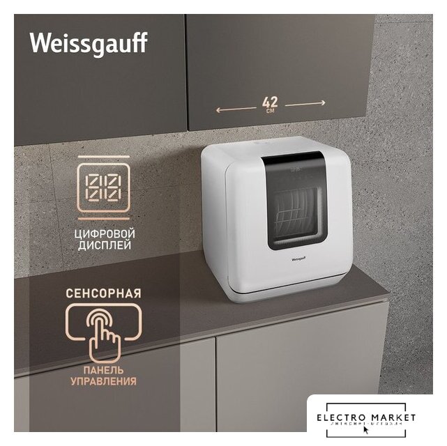 загрузка на 6 комплектов посуды, сенсорное управление, 5 программ, белый цвет, сушка: стандартная (конденсация), индикация на полу: нет
