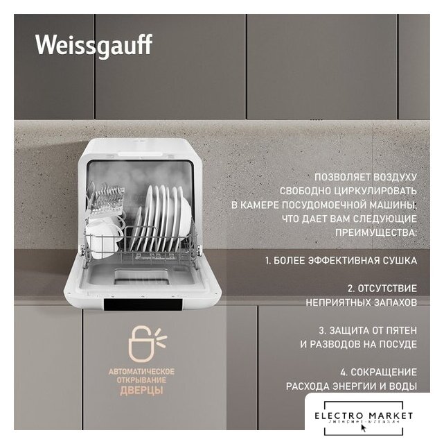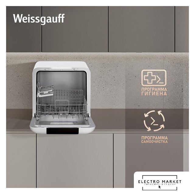 загрузка на 6 комплектов посуды, электронное управление, 6 программ, белый цвет, сушка: стандартная (конденсация), индикация на полу: нет