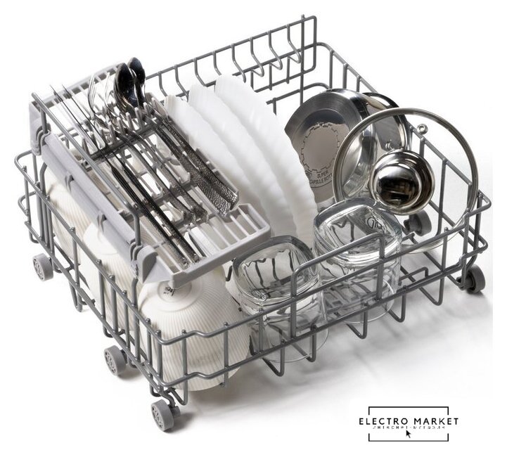 загрузка на 6 комплектов посуды, электронное управление, 7 программ, серебристый цвет, сушка: с теплообменником, индикация на полу: нет