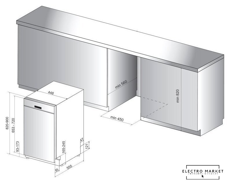 загрузка на 10 комплектов посуды, сенсорное управление, 8 программ, 44.6x55x82 см, черный цвет, сушка: с открыванием дверцы, индикация на полу: луч