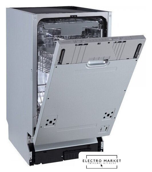 загрузка на 10 комплектов посуды, электронное управление, 6 программ, 44.5×55×82 см, черный цвет, сушка: конденсационная, половинная загрузка, индикация на полу: луч