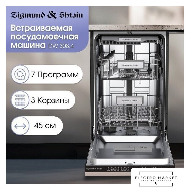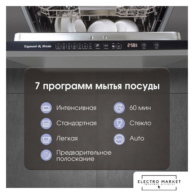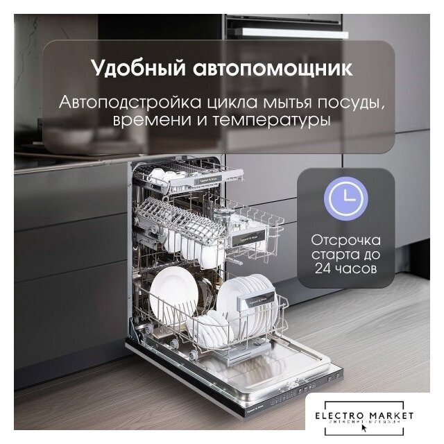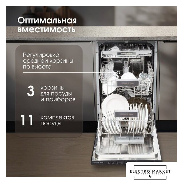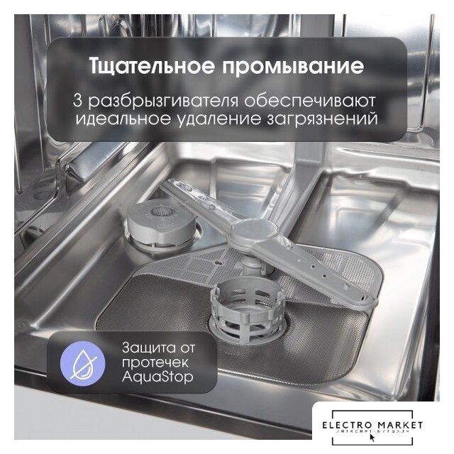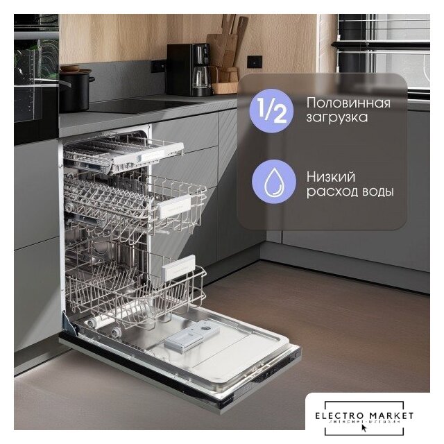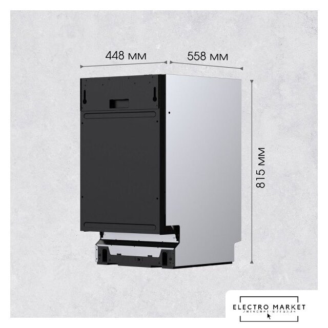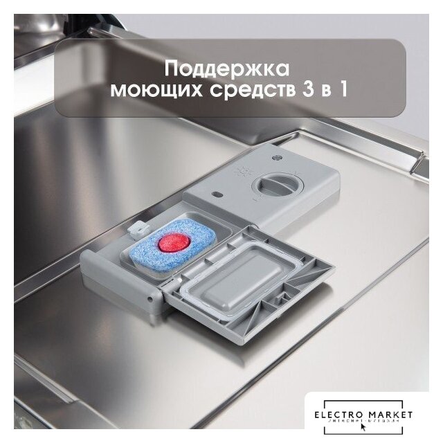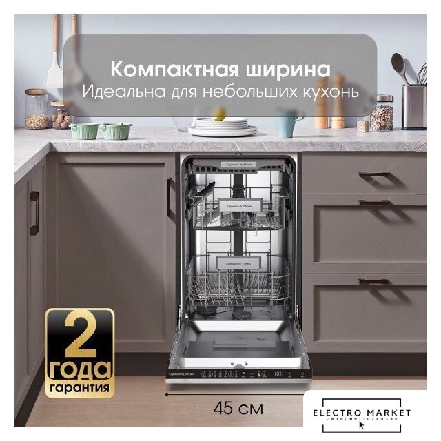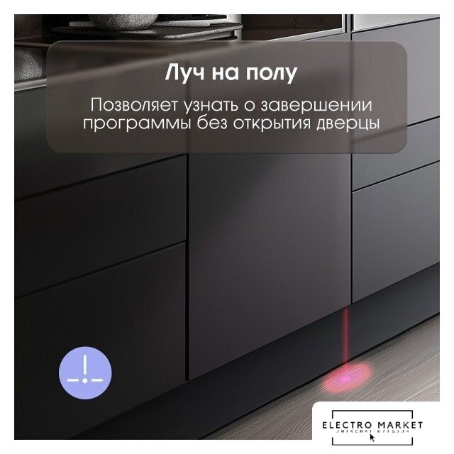 загрузка на 10 комплектов посуды, электронное управление, 9 программ, 44.8×55×82 см, нержавеющая сталь цвет, сушка: конденсационная, половинная загрузка, индикация на полу: луч