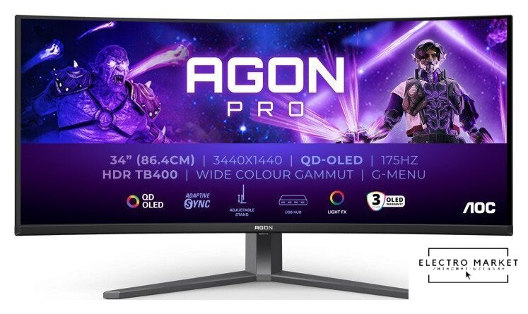 34", 21:9, 3440x1440, OLED, изогнутый (1800R), 175 Гц, VESA Adaptive-Sync, интерфейсы HDMI+DisplayPort, регулировка высоты