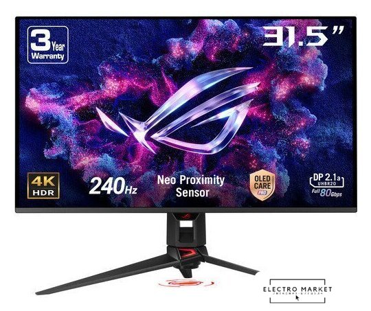 31.5", 3840x2160, 16:9, OLED, 240 Гц, глубина 10 бит, яркость 275 нит, HDR10, HDMI+DisplayPort, регулировка высоты, портретный режим