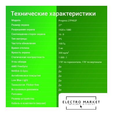 27", 16:9, 1920x1080, IPS, 100 Гц, AMD FreeSync, динамики, интерфейсы HDMI+D-Sub (VGA)