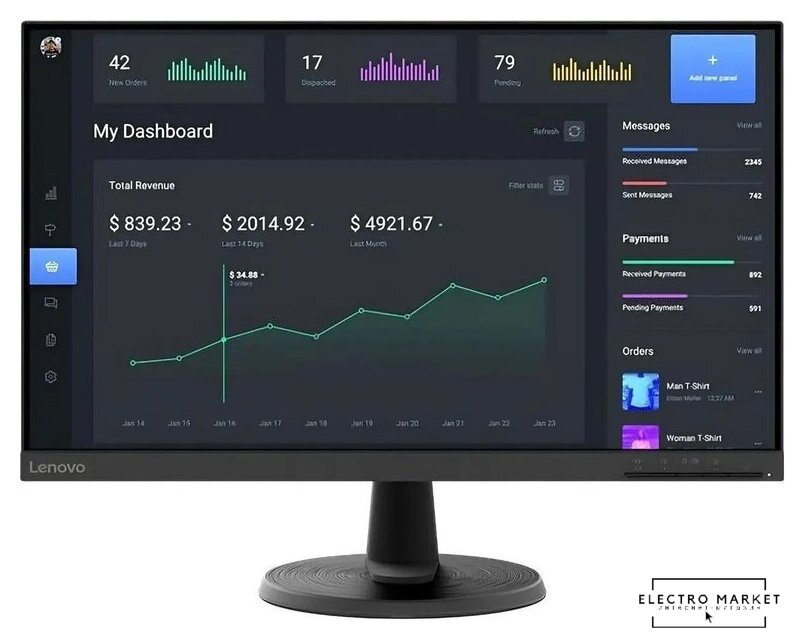 23.8", 1920x1080, 16:9, IPS, 100 Гц, глубина 6 бит + FRC, яркость 250 нит, динамики, HDMI+DisplayPort+USB Type-C, питание по USB-C до 65 Вт, регулировка высоты, портретный режим