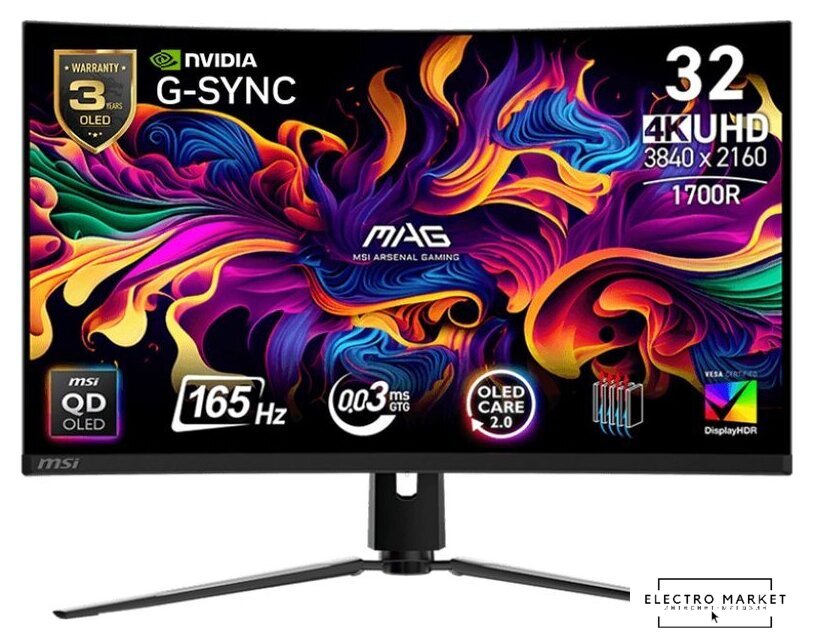 31.5", 16:9, 3840x2160, OLED, подсветка с квантовыми точками, 165 Гц, VESA Adaptive-Sync, динамики, интерфейсы HDMI+DisplayPort, регулировка высоты, портретный режим