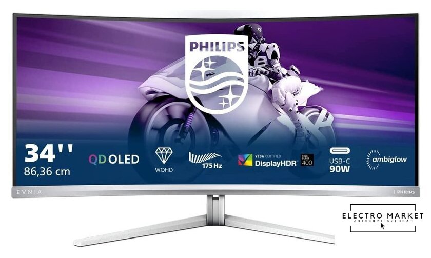 34", 3440x1440, 21:9, изогнутый, кривизна 1800R, OLED, 175 Гц, c квантовыми точками, глубина 10 бит, яркость 250 нит, HDMI+DisplayPort+USB Type-C+USB Type-A, питание по USB-C до 15 Вт, регулировка высоты
