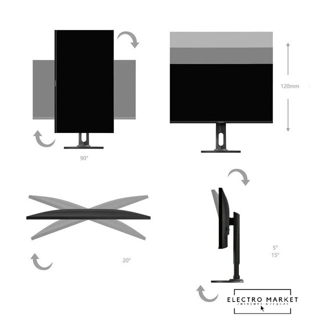 23.8", 1920x1080, 16:9, IPS, 120 Гц, глубина 8 бит, яркость 300 нит, динамики, HDMI+DisplayPort+D-Sub (VGA), питание по USB-C до 15 Вт, регулировка высоты, портретный режим