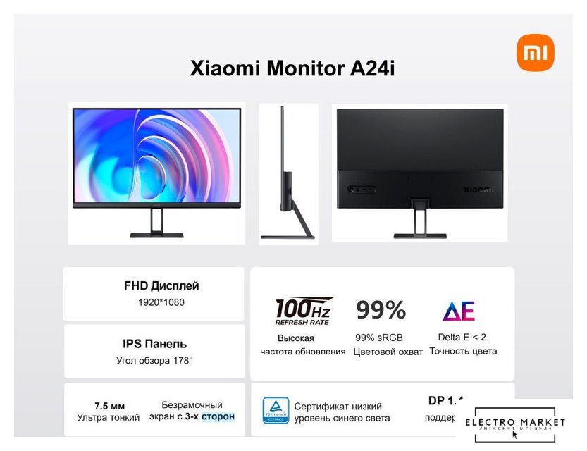 23.8", 16:9, 1920x1080, IPS, 100 Гц, AMD FreeSync, динамики, интерфейсы HDMI+D-Sub (VGA)+DisplayPort, регулировка высоты, портретный режим