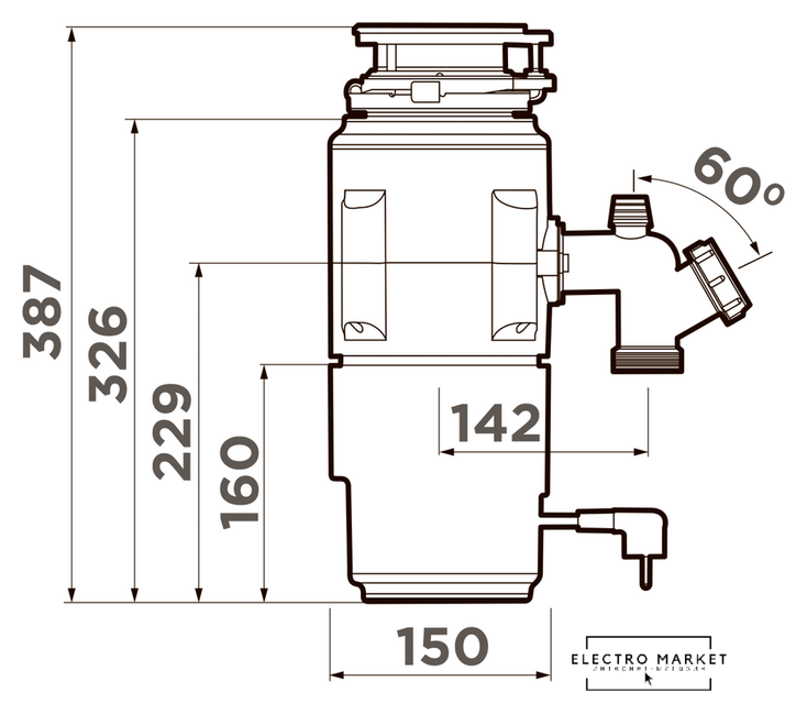 электрический, индукционный двигатель, 0.75 л.с., 560 Вт, 2200 об/мин, управление: дистанционная кнопка, камера 1.1 л, композитный материал, 3-ступенчатое измельчение, непрерывная загрузка, с защитой от перегрузок, 54 дБ