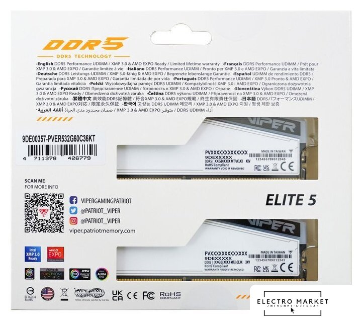 32 ГБ, 2 модуля DDR5 DIMM по 16 ГБ, частота 6400 МГц, CL 30T, напряжение 1.45 В