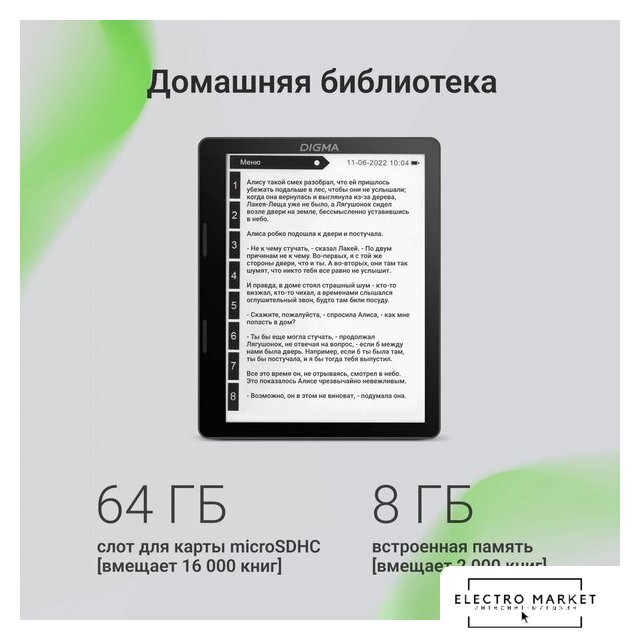 экран 6" E-Ink Pearl HD, 758 x 1014, память 4 Гб, карты памяти