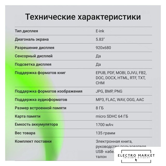 | Комплект поставки | Электронная книга, руководство пользователя, USB- кабель, гарантийный талон |