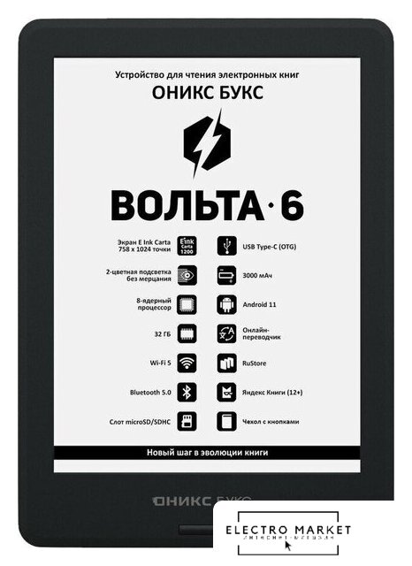 экран 6" E-Ink Carta 1200, 758 x 1024, сенсорный, с подсветкой, память 32 Гб, карты памяти, Wi-Fi