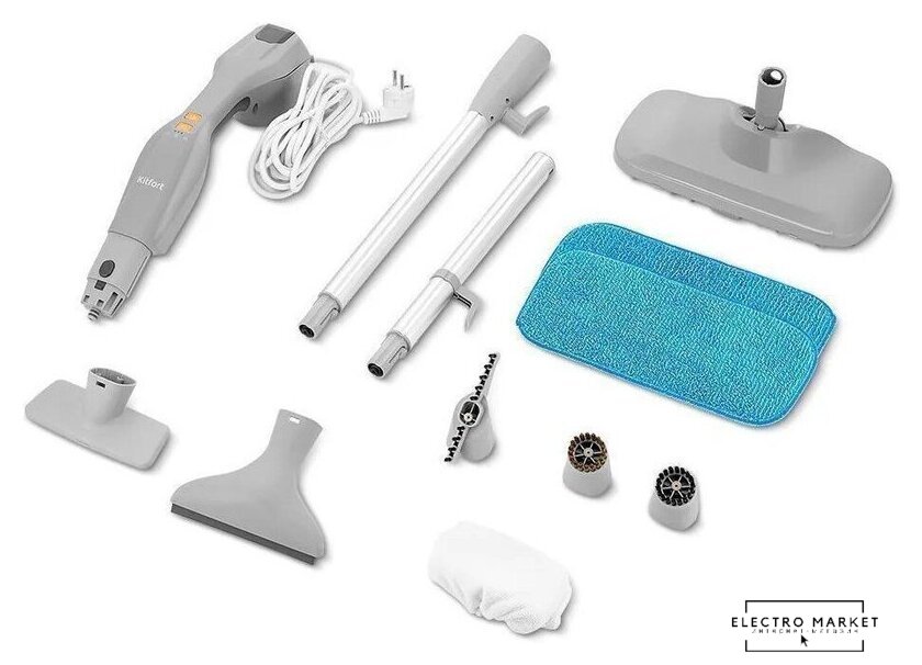 | Комплектация | паровая швабра, насадка для пола с тряпкой, насадка со скребком, плоская и круглая нейлоновые щетки, насадка с ворсовой щеткой, тряпка для отпаривания, мерный стакан, руководство пользователя |
