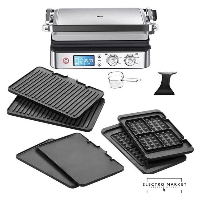 Комплектация | Электрогриль со съемными нагревательными пластинами: гладкая, ребристая, вафельницаМерная чашечкаЛопатка |