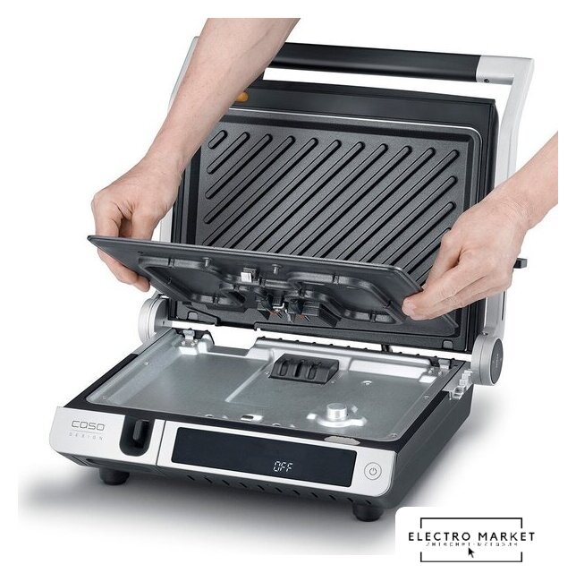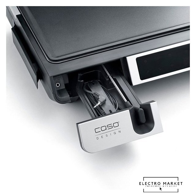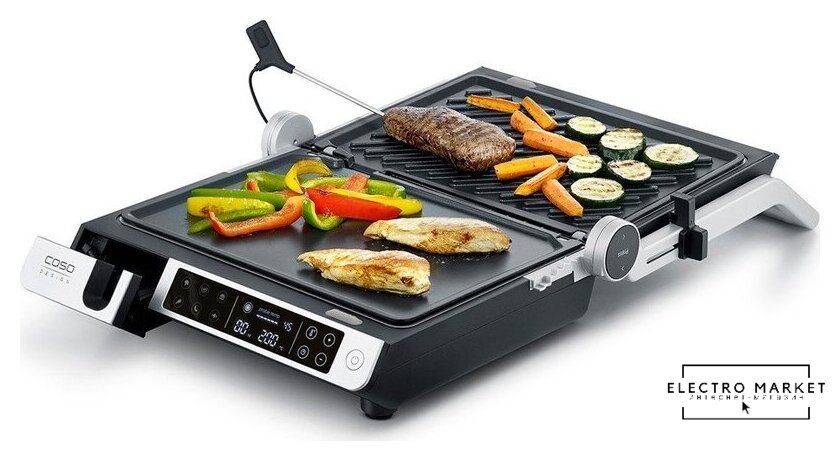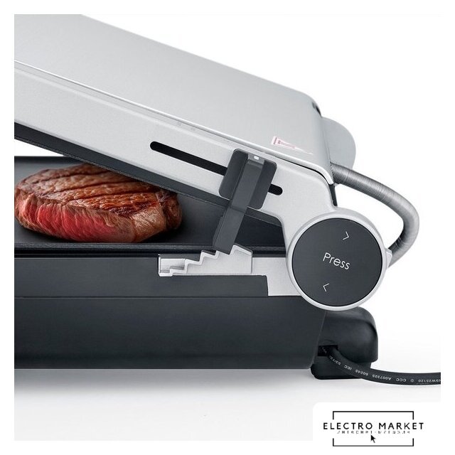 | Комплектация | выносной термометр-щуп; съёмные гладкая и рифленая пластины; лоток для сбора жира; инструкция |