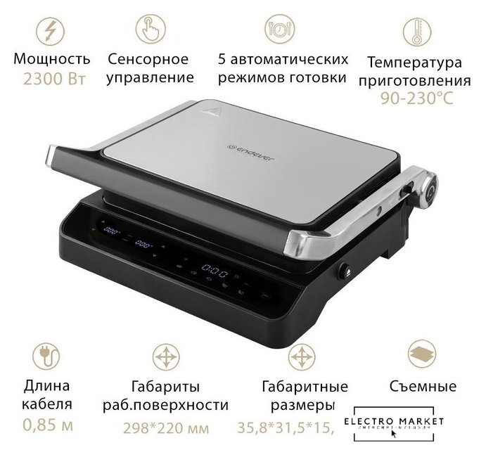 2000 Вт, универсальный, двухсторонний (гриль-пресс), габариты 355x380 мм, рабочая поверхность 230x290 мм