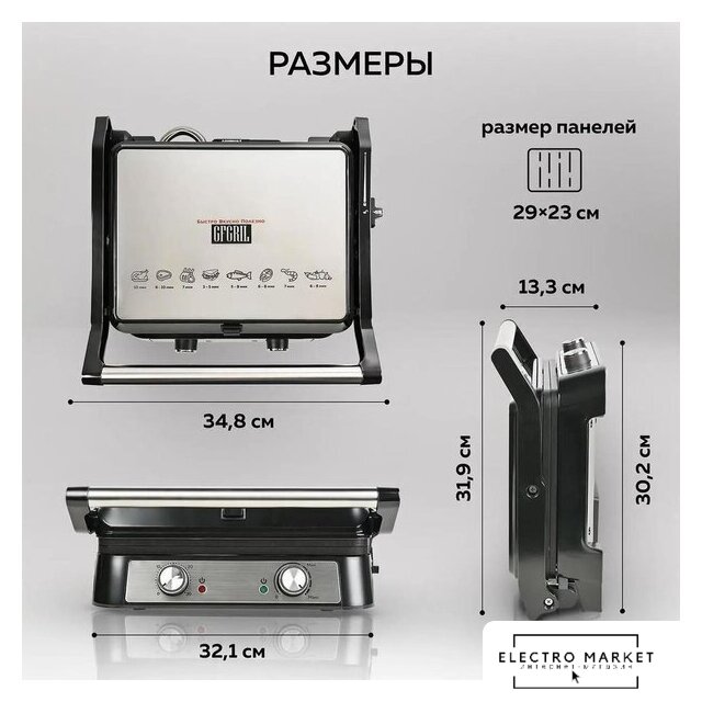 2000 Вт, универсальный, двухсторонний (гриль-пресс), габариты 355x380 мм, рабочая поверхность 230x290 мм