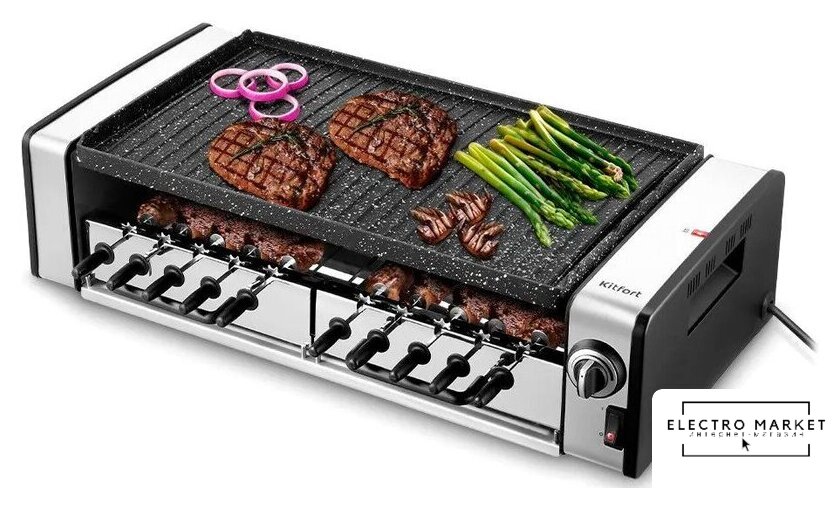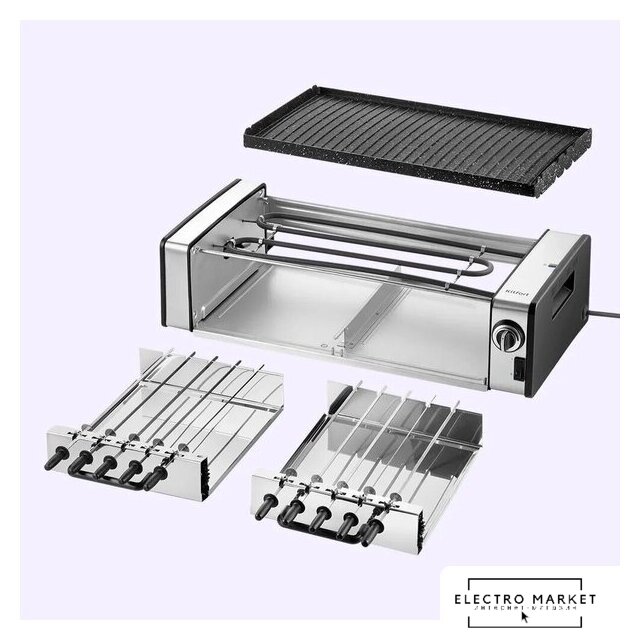 | Комплектация | 10 шампуров; съемная двусторонняя панель гриля; съемный контейнер для сбора жира и сока; держатели для шнура; инструкция |