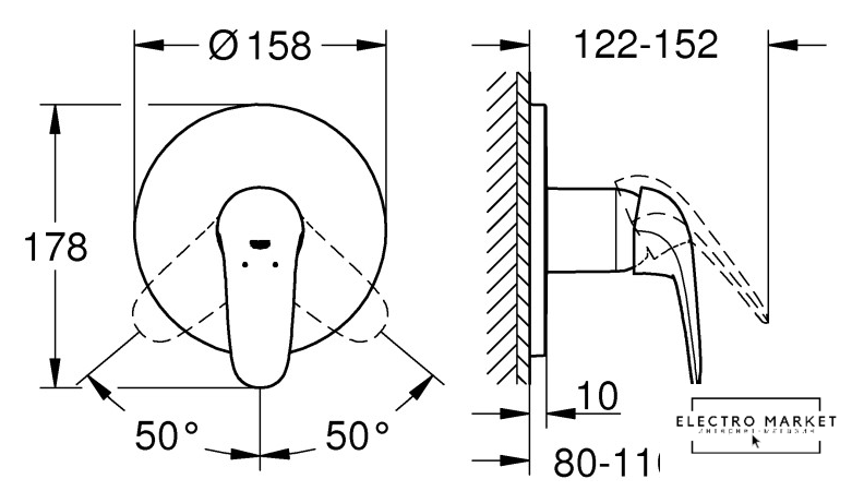 однорычажный смеситель для ванны и душа, монтаж на стену