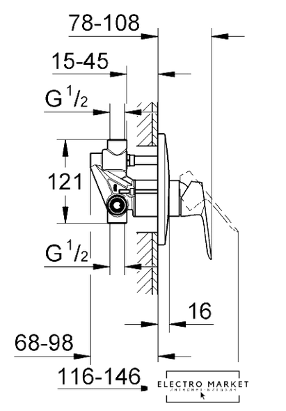 однорычажный смеситель для ванны и душа, монтаж на стену