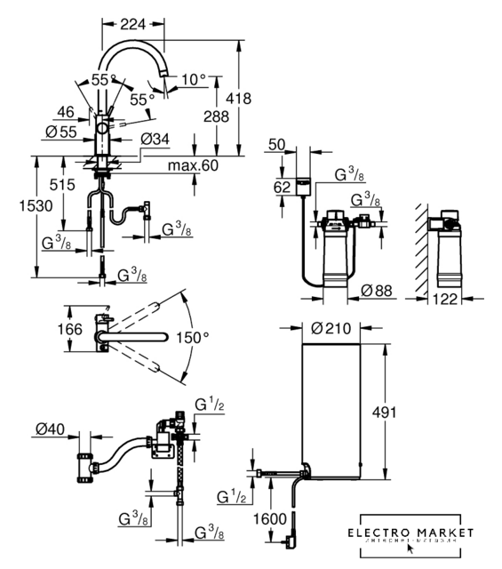 Поворотный излив | 150 ° |