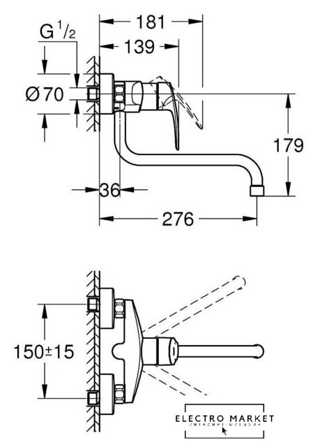 однорычажный смеситель для ванны и душа, монтаж на стену