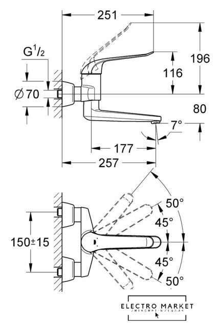 однорычажный смеситель для ванны и душа, монтаж на стену