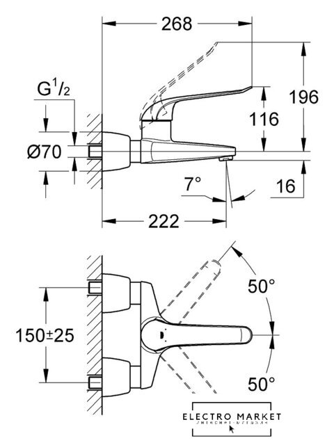 однорычажный смеситель для ванны и душа, монтаж на стену